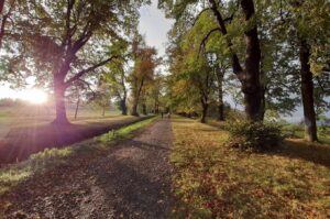 Roku 1973 byly stromy aleje prohlášeny za památné a o 20 let později se celý areál včetně lipové aleje stal kulturní památkou. K velké aleji byla v letech 1885 – 1889 na popud okrašlovacího spolku v Bruntále vysázena lípami od Kobylího rybníka tzv. „promenádní cesta“. Podél horní části této promenádní cesty bylo v roce 1916 vztyčeno 14 stojanů s obrazy křížové cesty, které namaloval malíř Franz Templer podle předloh Gebhardta Fugela z Mnichova. Původní křížová cesta však vydržela jen krátce. Po II. světové válce byla torza jednotlivých zastavení odstraněna. Na svou obnovu čekala až do roku 2001. S myšlenkou nové podoby cesty přišel bruntálský umělecký řezbář pan František Nedomlel. Nových 14 zastavení tvoří velice originální křížovou cestu, která nemá v České republice obdoby. Řezbář František Nedomlel zhotovil během čtyř let patnáct zastavení. Jednotlivá zastavení vznikla díky aktivitě lidí z celé republiky, kteří na jejich vybudování vybrali téměř dva miliony korun. Podstavce jsou utvořeny z různých druhů hornin z okolí, dřevěné plastiky znázorňující výjevy z Kristovy cesty na Golgotu zase z různých druhů dřev, vyskytujících se v Nízkém Jeseníku. Na čelních stranách kvádrů jsou umístěny mramorové desky s nápisem donátora zastavení.